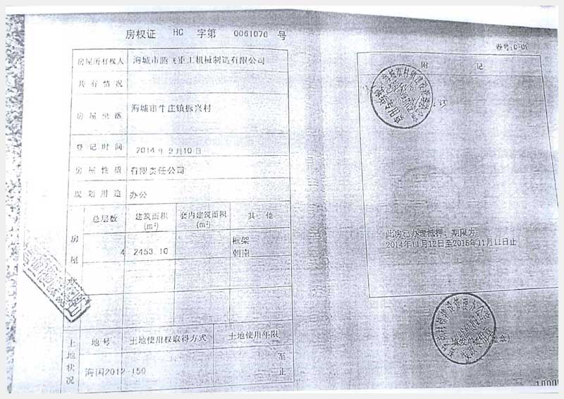 名稱:海城市騰飛重工機(jī)械制造有限公司房產(chǎn)及土地使用權(quán) 面積:房產(chǎn):10598.84㎡;土地:43572㎡ 瀏覽次數(shù):1091